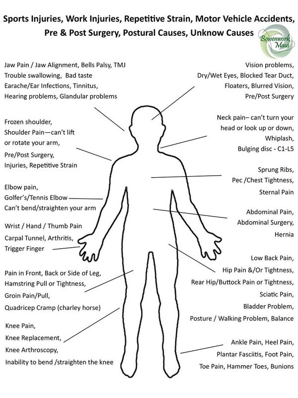If a new injury has occurred, come in and see me as soon as possible before any restrictions have set in. If you have a long standing issue come in and see what this fabulous technique can do for you. You don't have to accept your current state as the way it has to be; chronic conditions respond to Bowenwork and can improve.